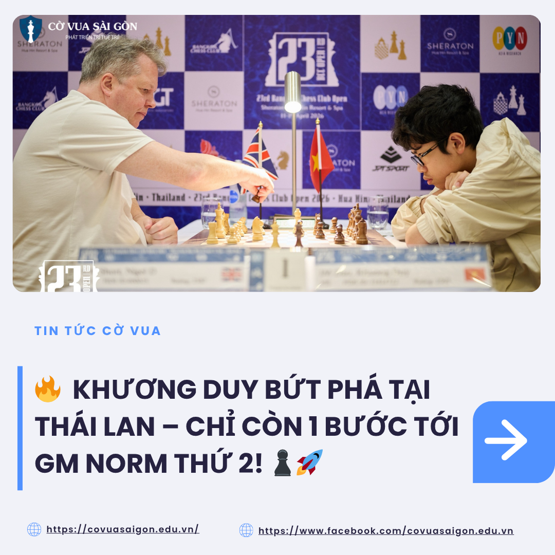 KHƯƠNG DUY BỨT PHÁ TẠI THÁI LAN – CHỈ CÒN 1 BƯỚC TỚI GM NORM THỨ 2! 🇻🇳♟️ Kỳ thủ trẻ Đầu Khương Duy đang “cháy máy” tại Bangkok Chess Club Open 2026 với phong độ cực cao: 🌟 6/7 …
