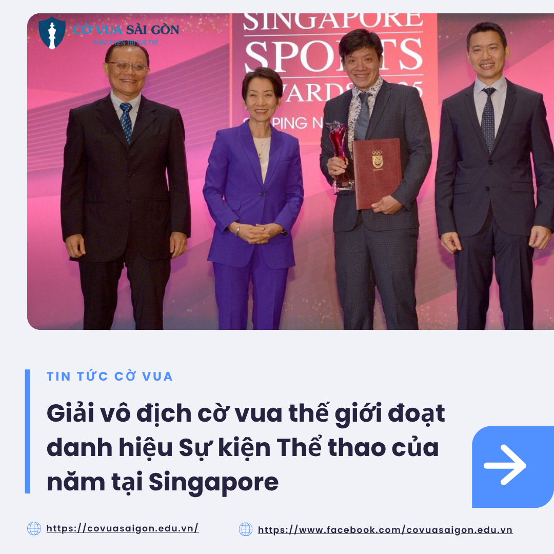 Ngày 28/06/2025 – Trận đấu tranh chức vô địch cờ vua FIDE 2024 giữa Gukesh D và Ding Liren đã được vinh danh là “Sự kiện Thể thao của năm (Triển lãm/Thi đấu)” tại Lễ trao giải Singapore Sports Awards 2025. Sự kiện này được tổ chức tại Singapore, với đỉnh cao là việc Gukesh trở thành nhà vô địch cờ vua trẻ nhất thế giới, thu hút người hâm mộ trên toàn cầu. Giải thưởng không chỉ ghi nhận những trận đấu gay cấn, mà còn tôn vinh công tác tổ chức chuyên nghiệp và sự gắn kết cộng đồng của sự kiện — tạo nên một dấu mốc đáng nhớ trong lịch sử cờ vua.
