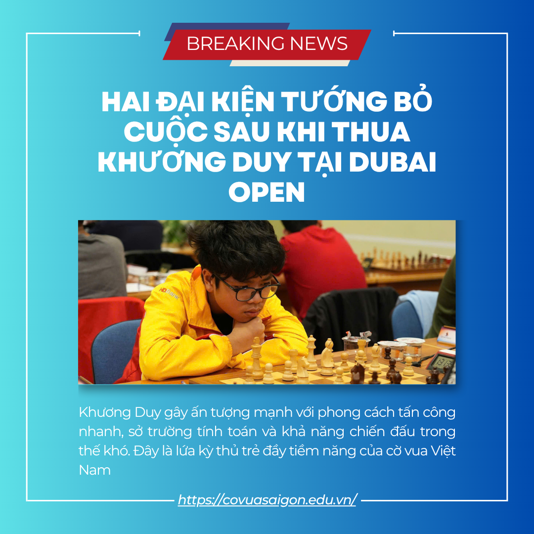 Dubai Open 2025 – giải cờ vua tiêu chuẩn 9 vòng theo thể thức Thụy Sĩ tại UAE từ 27/5 đến 4/6 – chứng kiến cú sốc khi hai Đại kiện tướng kỳ cựu Emre Can (Thổ Nhĩ Kỳ, Elo 2568) và Abhijeet Gupta (Ấn Độ, Elo 2577) lần lượt bỏ giải sau trận thua trước kỳ thủ 14 tuổi Đầu Khương Duy (Elo 2445).