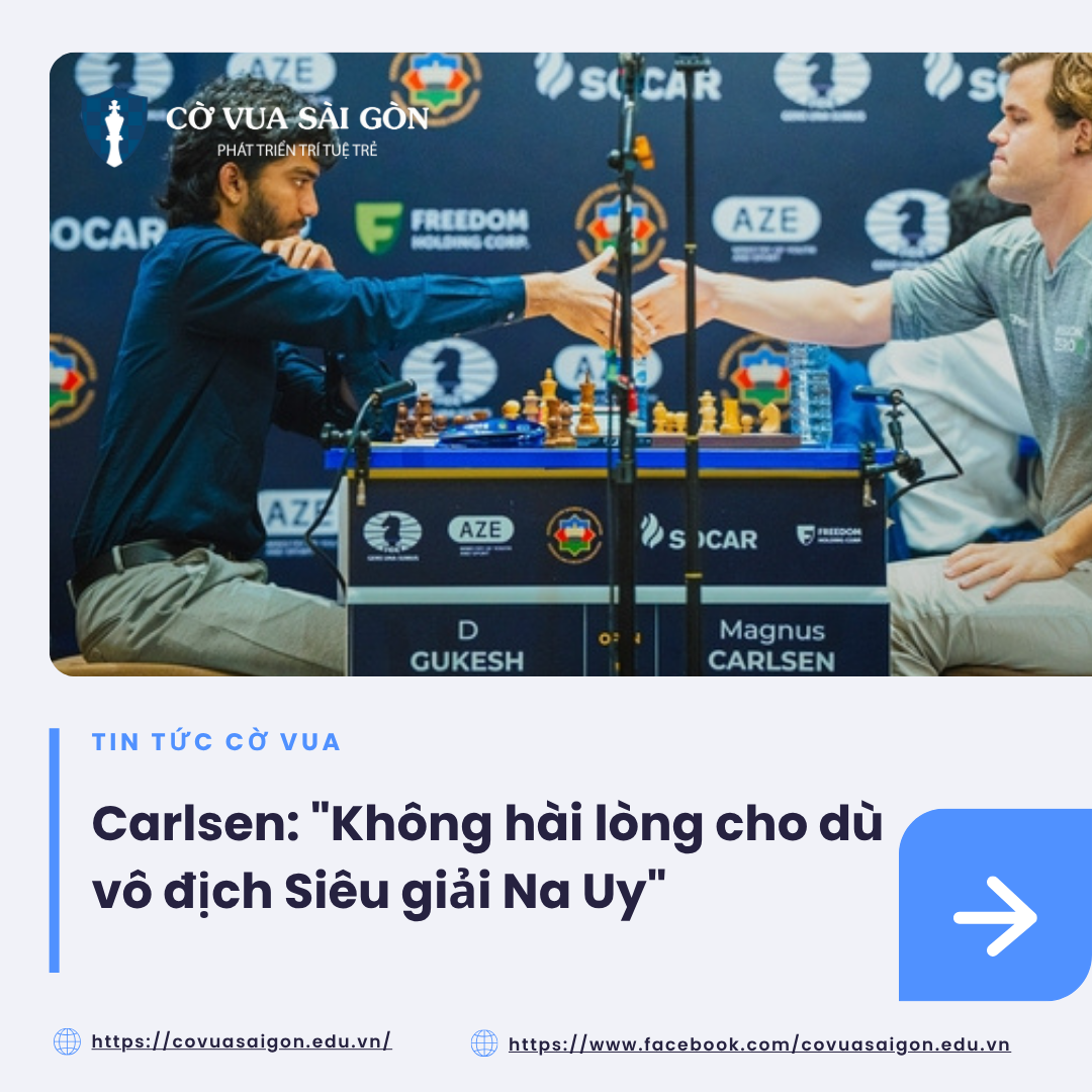 Stavanger, Na Uy – 6/6/2025 – Dù đã chính thức đoạt cúp vô địch Siêu giải Na Uy 2025, kỳ thủ số một thế giới Magnus Carlsen vẫn không cảm thấy thỏa mãn — và nguyên nhân đến từ trận thua bất ngờ trước tài năng trẻ Gukesh Dommaraju cách đây vài ngày .